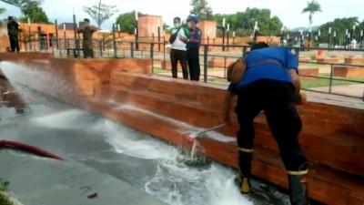 Kotor oleh Aktivitas Warga, Satpol PP dan Damkar Majalengka Ramai-Ramai 'Pel' Alun-alun
