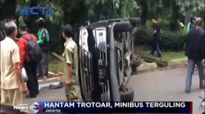 Hantam Trotoar, Minibus Terguling di Jalan Brawijaya Raya