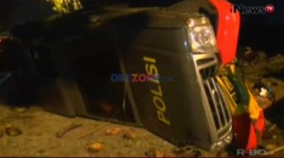 Mobil Brimob Tabrak Pohon hingga Terbalik