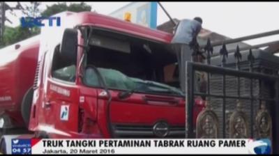 Truk Tangki Pertamina Tabrak Showroom Mobil