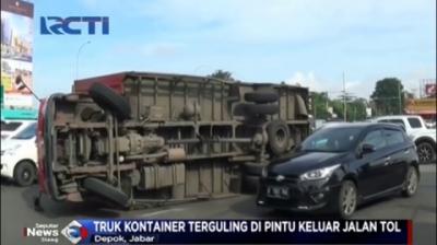 Truk Kontainer Terguling di Pintu Keluar Jalan Tol Cijago