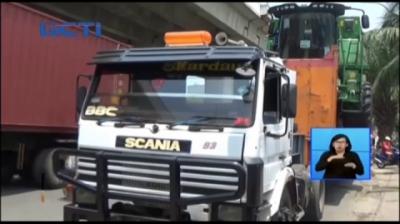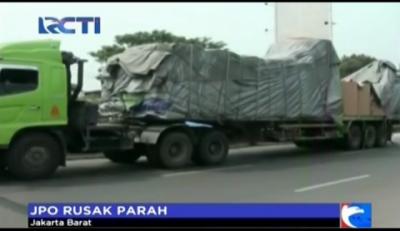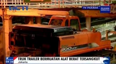 Truk Pengangkut Alat Berat Tersangkut JPO di Cengkareng