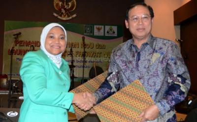 Ketua Fatayat Nahdlatul Ulama (NU) DKI Jakarta Karimah Hamid (kiri) bersama calon Wakil Gubernur DKI Jakarta Nachrowi Ramli (tengah) dan Ketua DPR RI Marzuki Alie (kanan), saat hadir dalam acara halal bihalal Patayat NU di Hotel Twin Plaza, Jakarta Barat, Minggu (26/8/2012). Halal bihalal tersebut digelar untuk memperkuat tali silaturahmi.