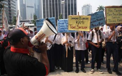 Menteri Pendidikan dan Kebudayaan (Mendikbud) Mohammad Nuh (tengah) bersama Dirjen Pendidikan Menengah Kemendikbud Hamid Muhammad (kiri) dan Dirjen Pendidikan Dasar Kemendikbud Suyanto (kanan) menekan tombol saat membuka Olimpiade Sains Nasional XI di Padepokan Pencak Silat, Taman Mini Indonesia Indah, Jakarta Timur, Senin (3/9/2012). Olimpiade Sains Nasional XI diikuti sekitar 3.000 peserta dari seluruh Indonesia jenjang SD, SMP, SMA, SMK, PKLK (pendidikan dasar dan menengah), serta para guru yang akan diselenggarakan pada tanggal 3-6 September 2012.