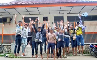 Vice President Business Development Blue Bird Group Noni Purnomo (tengah) bersama President Director 7 Eleven Indonesia Hendri Honoris (tiga kiri) dan anak-anak jalanan, di sela acara nonton bareng film Cita-citaku Setinggi Tanah Arahan di 7 Eleven, Kelapa Gading, Jakarta, Senin (22/10/2012). Blue Bird Group bersama 7 Eleven mengadakan nonton bareng anak-anak jalanan sebagai bentuk kepedulian terhadap anak-anak yang kurang mampu.