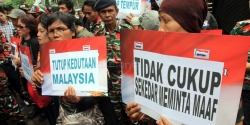 Aktivis Migrant Care melakukan aksi unjuk rasa di depan Kedutaan Besar Malaysia, Jalan HR Rasuna Said, Jakarta Selatan, Jumat (16/11/2012). Mereka menuntut kepada Pemerintah Indonesia dan Pemerintah Malaysia untuk menuntaskan kasus pemerkosaan beberapa Tenaga Kerja Indonesia (TKI) dan menghukum seberat-beratnya para pelaku pemerkosaan. Selain itu mereka mendesak Pemerintah Indonesia untuk segera mengesahkan Rancangan Undang-Undang Pekerja Rumah Tangga (RUU PRT).