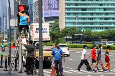 Pekerja melakukan perbaikan lampu lalu lintas yang mati di Jalan Diponegoro, Jakarta Pusat, Selasa (5/2/2013). Perbaikan tersebut rutin dilakukan guna kenyamanan para pengendara yang melintasi kawasan tersebut.