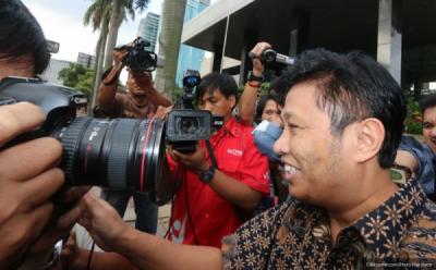 Anggota DPR RI dari Partai Amanat Nasional (PAN) Eko Hendro Purnomo atau lebih dikenal Eko Patrio memberikan keterangan kepada wartawan usai diperiksa penyidik Komisi Pemberantasan Korupsi (KPK) di Gedung KPK, Jalan HR Rasuna Said, Jakarta Selatan, Selasa (12/2/2013). Eko diperiksa sebagai saksi terkait penyidikan proyek pembangunan sport centre Hambalang.