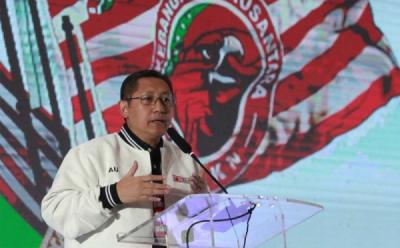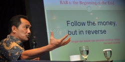 Juru Bicara Komisi Pemberantasan Korupsi (KPK) Johan Budi memberikan keterangan pers perihal penetapan tersangka terhadap Ketua Umum Partai Demokrat Anas Urbaningrum di Gedung KPK, Jalan HR Rasuna Said, Jakarta Selatan, Jumat (22/2/2013). Anas ditetapkan sebagai tersangka dalam kasus dugaan korupsi proses perencanaan dan pelaksanaan pembangunan proyek pusat pendidikan dan pelatihan dan sekolah olahraga nasional di Hambalang, Bogor, Jawa Barat.