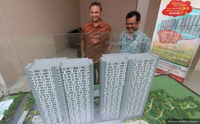 Menteri Negara BUMN Dahlan Iskan bersama Direktur Utama Perum Perumnas Himawan Arief Sugoto (kedua kanan) dan sejumlah warga melihat maket Rusunami Tower A4 dan A5 di Bandar Kemayoran, Jakarta Pusat, Kamis (21/3/2013). Perumnas segera membangun Tusunami Tower A4 dan A5. Pembangunan rusunami ini merupakan keberlanjutan program 1.000 tower yang pernah dicanangkan oleh Presiden Susilo Bambang Yudhoyono.