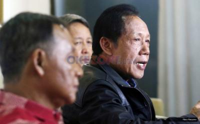 Ketua Umum Partai Keadilan dan Persatuan Indonesia (PKPI) Sutiyoso (tengah) mengangkat tangan bersama dengan para partai pendukung yang bergabung ke PKPI di DPP PKPI, Jalan Diponegoro, Jakarta Pusat, Senin (1/4/2013). Sedikitnya 12 partai politik menandatangani nota kesepahaman dengan PKPI, salah satu kesepakatan yakni kader masing-masing parpol akan menjadi calon legislatif dengan kemampuan masing-masing parpol lewat koordinasi PKPI.