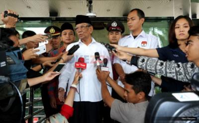 Mantan Ketua Umum Pengurus Besar Nahdlatul Ulama (PBNU) KH Hasyim Muzadi memberikan keterangan kepada wartawan terkait kedatangannya ke Gedung Komisi Pemberantasan Korupsi, Jalan HR Rasuna Said, Jakarta Selatan, Jumat (7/6/2013). Hasyim mengaku datang untuk menemui Ketua KPK Abraham Samad. Sebelumnya, Hasyim pernah menyambangi KPK bersama tokoh lainnya untuk memberikan dukungan moral kepada KPK yang tengah berseteru dengan Kepolisian soal penanganan kasus dugaan korupsi proyek simulator ujian SIM.