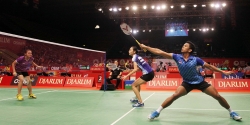 Atlet bulutangkis Indonesia Edi Subaktiar (kedua kanan) dan Melati Daeva Oktaviani (kedua kiri) belajar membatik di sela-sela acara makan malam bersama Djarum Indonesia Open Super Series 2013 di Hotel Sultan, Jakarta, Selasa (11/6/2013). Acara kali ini mengangkat batik Indonesia yang bertujuan mempromosikan dan memperkenalkan batik kepada para atlet bulutangkis yang berlaga di ajang Djarum Indonesia Open Super Series 2013.