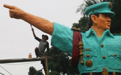 Pekerja melakukan perawatan Patung Pemuda Membangun di Bundaran Air Mancur Senayan, Jakarta, Selasa (5/11/2013). Perawatan tersebut dilakukan agar patung tetap terlihat bersih, terpelihara dan menjaga keindahan serta kualitasnya.