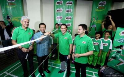 Duta Milo School Competition Taufik Hidayat(kedua kiri), Duta Milo School Competition Tommy Sugiarto (kanan), Kasubdit Pelatnas PBSI Ricky Subagja (kedua kanan) dan Business Executive Beverages PT Nestle Indonesia Prawitya Soemardjo memberikan keterangan perihal Milo School Competition di Jakarta, Rabu (29/1/2014). Milo School Competition akan berlangsung di empat kota, Yogyakarta, Cirebon, Surabaya dan Palembang. Para juara dari empat kota tersebut akan bertanding melawan para atlet nasional pada "perang bintang".