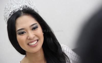Salah satu kontestan yang masuk 15 besar Miss Indonesia 2014 saat menjawab pertanyaan.