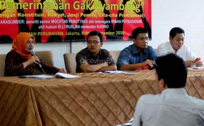 Dari ki-ka: Anggota Timwas Century Bambang Susatyo, moderator Latief Siregar, Ekonom UI Faisal Basri, dan Pakar Komunikasi Politik Hery Budianto menjadi pembicara dalam diskusi polemik yang mengangkat tema "Century Bikin Ngeri" di Warung Daun, Cikini, Jakarta Pusat, Sabtu (8/3/2014).