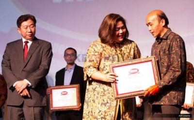 CEO Frontier Consulting Group Handi Irawan (kiri) berbincang dengan Direktur Astra Agro Lestari Joko Suprioyo usai menerima penghargaan Corporate Image Award 2014 di Jakarta, Selasa (3/6/2014) malam. PT Astra Agro Lestari Tbk untuk kali ketujuh kembali meraih penghargaan dalam bidang reputasi perusahaan sawit.