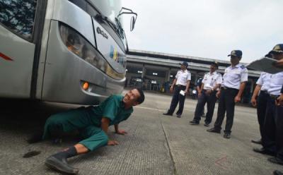 Petugas Dinas Perhubungan Kota Cirebon melakukan pemeriksaan kelaikan bus di Terminal Harjamukti, Kota Cirebon, Jawa Barat, Selasa (22/7/2014). Pemeriksaan tersebut dilakukan untuk meminimalisir kecelakaan akibat bus yang tidak laik jalan.