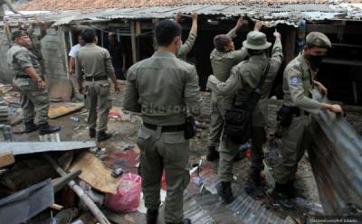 Petugas menggunakan ekskavator membongkar bangunan di Jalan Raya Fatmawati, Jakarta Selatan, Rabu (3/9/2014). Pembongkaran puluhan bangunan permanen oleh Tim Gabungan Pemkot Jakarta Selatan itu dilakukan untuk pengerjaan proyek jalur Mass Rapid Transit (MRT).