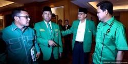 Direktur Jenderal Administrasi Hukum Umum (AHU) Kemenkum HAM Harkristuti Harkrisnowo (kiri) menerima Pelaksana Tugas (plt) Ketua Umum Partai Persatuan Pembangunan (PPP) Emron Pangkapi (tengah) bersama Sekretaris Jenderal DPP PPP Romahurmuziy (kanan) di Kantor Kemenkum HAM, Jakarta, Senin (15/9/2014). Kedatangan sejumlah fungsionaris PPP untuk mendaftarkan perubahan struktur kepengurusan DPP PPP pasca-diberhentikannya Suryadharma Ali sebagai Ketua Umum PPP.