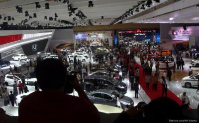 Menteri Perdagangan (Mendag) M Lutfi (batik merah), Menteri Pemuda dan Olahraga Roy Suryo (batik kuning) dalam kunjungan ke booth Honda pada pembukaan pameran otomotif Indonesia Internasional Motor Show (IIMS) ke 22 di JI Expo, Kemayoran, Jakarta Pusat, Kamis (18/9/2014). Pameran otomotif yang terbesar di Asia Tenggara ini berlangsung sampai 28 September 2014 mendatang. IIMS tahun ini menggandeng 36 merek mobil terkemuka, di mana 28 berasal dari kendaraan penumpang dan sisanya kendaraan komersial