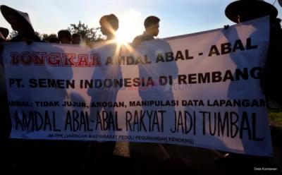 Sejumlah warga Batang membentangkan tulisan "Food Not Coal!" sebagai aksi bersama Greenpeace menolak rencana pembangunan pembangkit listrik bertenaga uap (PLTU) batu bara di areal persawahan Desa Ponowareng, Kabupaten Batang, Jawa Tengah, Selasa (23/9/2014). Menurut mereka, PLTU tersebut akan mengancam lahan sawah produktif di wilayah Batang yang selama ini dapat dipanen tiga kali dalam setahun.