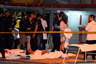 Sejumlah warga dan anggota Basarnas menurunkan korban kapal tenggelam dari Kapal Negara 225 Basarnas di Pelabuhan Raas, Sumenep, Jawa Timur, Rabu (8/10/2014).