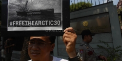 Aktivis Greenpeace melakukan aksi unjuk rasa di depan Istana Negara, Jakarta, Senin (27/10/2014).