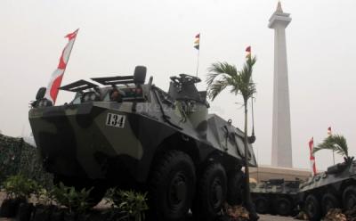 Petugas berjalan di dekat helikopter TNI AU pada pameran Indo Defence Expo 2014 di JI Expo Kemayoran, Jakarta, Rabu (5/11/2014).