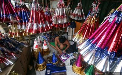 Penjual terompet bernama ibu Pudin, merapikan barang dagangannya di Jalan Barito, Kebayoran, Jakarta Selatan, Jumat (26/12/2014).