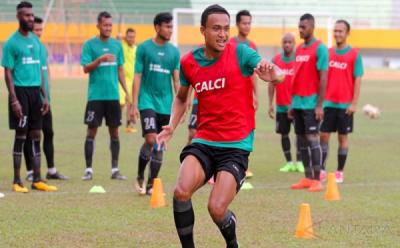 Pesepakbola Arema Indonesia I Gede Sukadana (kanan) berebut bola dengan pesepakbola Sriwijaya FC Syakir S (kedua kanan) saat pertandingan Trofeo Persija 2015.