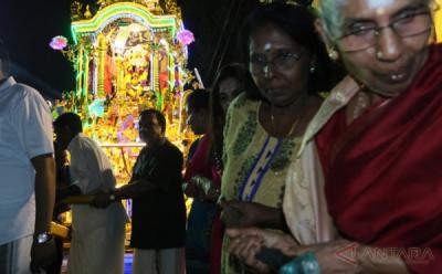 Ribuan penganut agama Hindu menuju ke kuil di dalam gua untuk acara keagamaan Thaipusam di Batu Caves, Selangor, Malaysia, Selasa (3/2/2015).