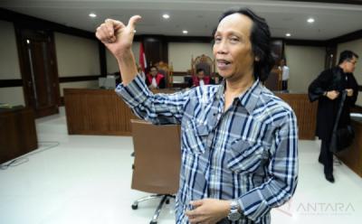 Seniman Betawi Mandra Naih berada di dalam mobil tahanan usai pemeriksaan selama lebih dari tujuh jam di Kejaksaan Agung, Jakarta Selatan, Jumat (6/3/2015).