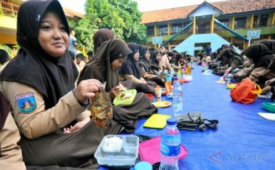 Ketua Umum Pergizi Pangan Prof Hardinsyah (batik) didampingi Manager Branch Process Development Quality Control PT Indofood CBP Sukses Makmur Tbk Mukharom JS pada acara Kampanye Sarapan Sehat berdialog dengan siswa siswi SDN 01 Lembang, Bandung,Jawa Barat, Sabtu (14/3/2015). Kampanye Sarapan Sehat tersebut di berikan kepada 1.200 siswa dan 500 guru yang diselenggarakan Indofood bekerjasama dengan Perhimpunan Pakar Gizi dan Pangan serta Asosiasi Institut Pendidikan Tinggi Gizi Indonesia dan dalam rangka Hari Gizi Nasional dan Pekan Sarapan Nasional (PESAN) 2015 yang bertemakan "Sehat dan Jajaan Aman Menuju Generasi Sehat Berprestasi".