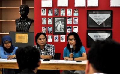 Koordinator KontraS Haris Azhar (kiri) dan Kadiv Pembelaan Hak Sipil Politik KontraS Putri Kanesia menunjukkan foto terpidana mati kasus pembunuhan berencana di Nias bernama Yusman Telaumbanua.