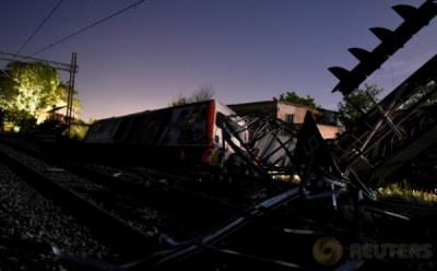 Petugas PT Kereta Api Indonesia memeriksa gerbong kereta yang anjlok di perlintasan Jalan A Yani, Surabaya, Jawa Timur, Selasa (17/3/2015) malam.