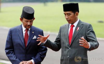 Sultan Brunei Darrusalam Hassanal Bolkiah (kanan) menuruni tangga pesawat saat tiba di Bandara Udara Halim Perdana Kusuma, Jakarta Timur, Selasa (21/4/2015).