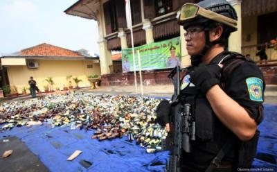 Petugas mengoperasikan alat berat untuk menghancurkan botol minuman keras (miras) di halaman Mapolres Jakarta Selatan, Rabu (10/6/2015).