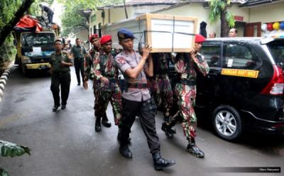 Tim SAR mempersiapkan peti jenazah yang akan digunakan untuk mengevakuasi korban jatuhnya pesawat Aviastar DHC6/PK-BRM.