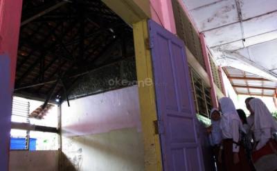 Siswa melihat kondisi ruang kelas yang rusak di SDN Klender 15, Jakarta Timur, Kamis (19/11/2015).