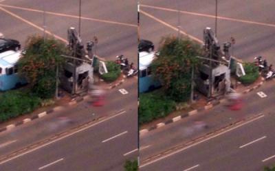 Polisi berada di Pospol Sarinah, Jakarta Pusat, Kamis (14/1/2016). Pospol tersebut mengalami kerusakan akibat pengeboman yang dilakukan terorisme.