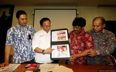 Seorang filatelis melihat perangko edisi Gerhana Matahari Total