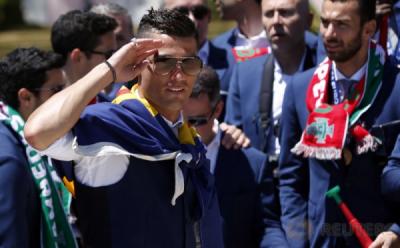 Cristiano Ronaldo bersama pemain timnas Portugal lainnya merayakan kemenangan mereka menjuarai Piala Eropa 2016. Portugal keluar sebagai jawara setelah mengalahkan tuan rumah Prancis lewat gol semata wayang yang dicetak Eder di masa perpanjangan waktu.
