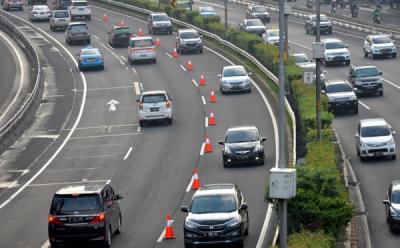 Kendaraan roda empat melintas di lajur tambahan yang berlawanan arah (Contra Flow) di ruas jalan Tol Jakarta-Cikampek Km 15 arah Cikampek, di Bekasi, Jawa Barat, Jumat (9/12/2016).