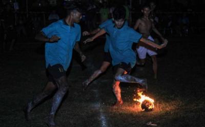 Salju yang menyelimuti lapangan tidak mengurungkan niat warga untuk bermain bola.