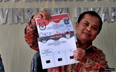 Ketua Komisi Pemilihan Umum Provinsi DKI Jakarta Sumarno memusnahkan surat suara rusak dan berlebih di Kantor KPUD DKI Jakarta, Selasa (14/2/2017).