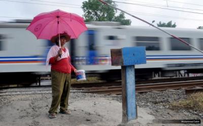 Seorang warga menyodorkan kotak sumbangan kepada pengendara melintasi perlintasan jalur rel kereta api