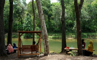 Warga beraktivitas di Taman Tabebuya Jagakarsa, Jakarta, Kamis (21/9/2017). Taman Tabebuya menjadi destinasi wisata alternatif dan murah bagi warga Ibu Kota untuk mengisi liburan.