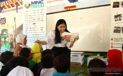 Relawan mendampingi anak-anak menulis proses mencapai cita-citanya di sekolah alam Kampung Batara di Papring, Banyuwangi, Jawa Timur, Minggu (24/9/2017).